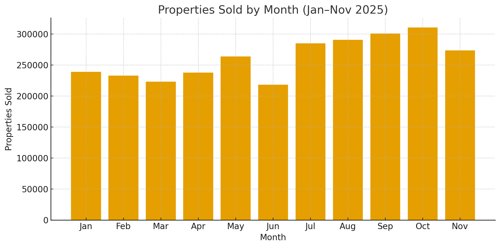 This chart clearly shows a steady rise in activity from mid-year, peaking in August through October, with October marking the highest sales volume.